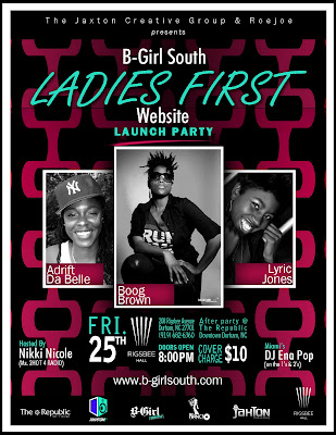 Mark your calendars and save the date! Next month B-Girl South will launch it’s new website with the “Ladies First: Women In Hip Hop Website Launch Party” in Durham, NC at Rigsbee Hall. The event will be hosted by Nikki Nicole with DJ Ena Pop on the tables all night, with an after party at The Republic.